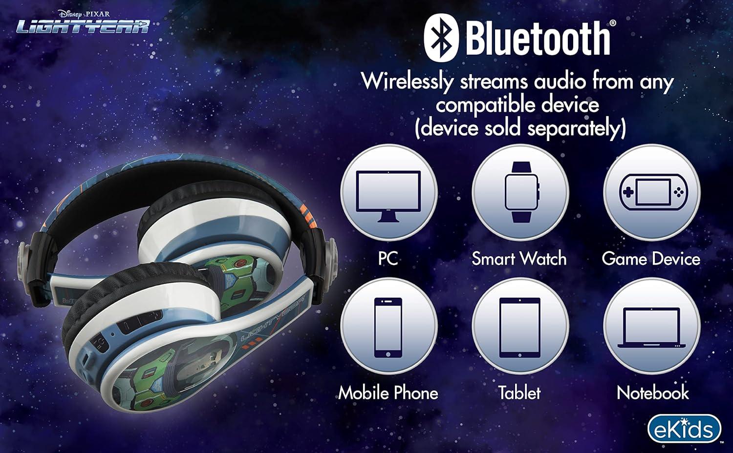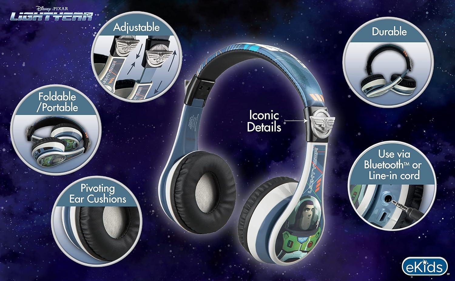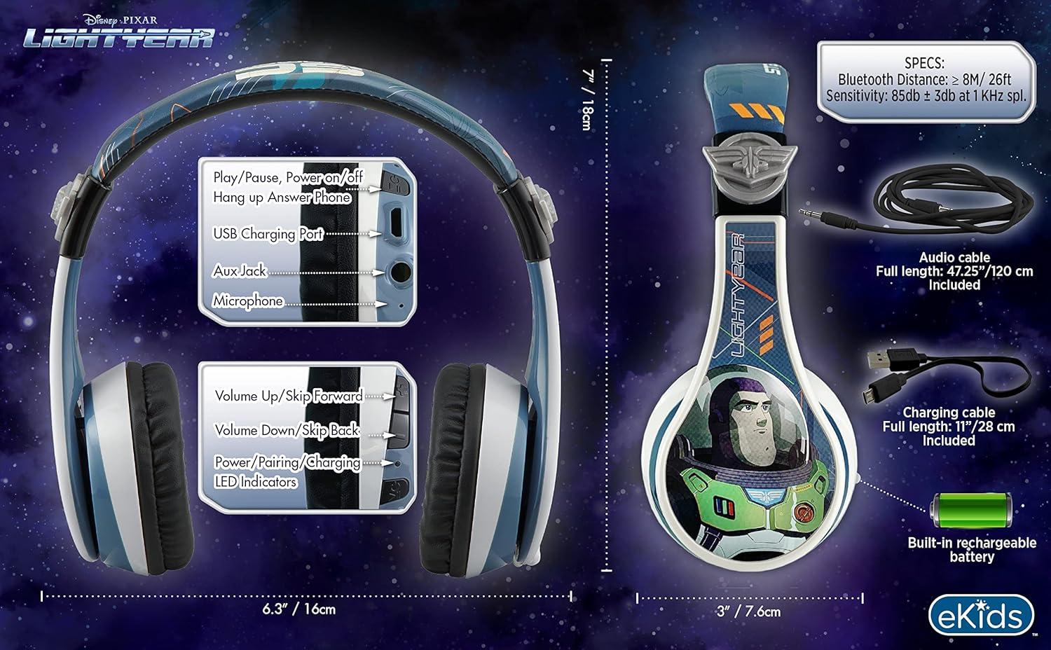 Disney Pixar Lightyear Kids Bluetooth Headphones, Wireless Headphones with Microphone Includes Aux Cord, Volume Reduced Kids Foldable Earphones for School, Home, or Travel