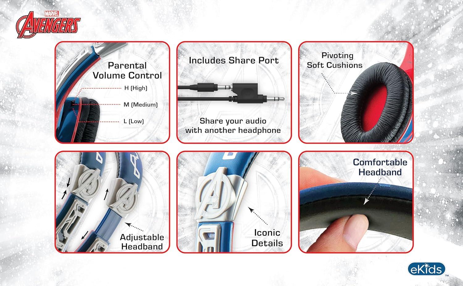 eKids Avengers Headphones for Kids, Wired Headphones for School, Home or Travel, Tangle Free Stereo Earphones with Volume Control, 3.5mm Jack, For Fans of Avengers Merchandise