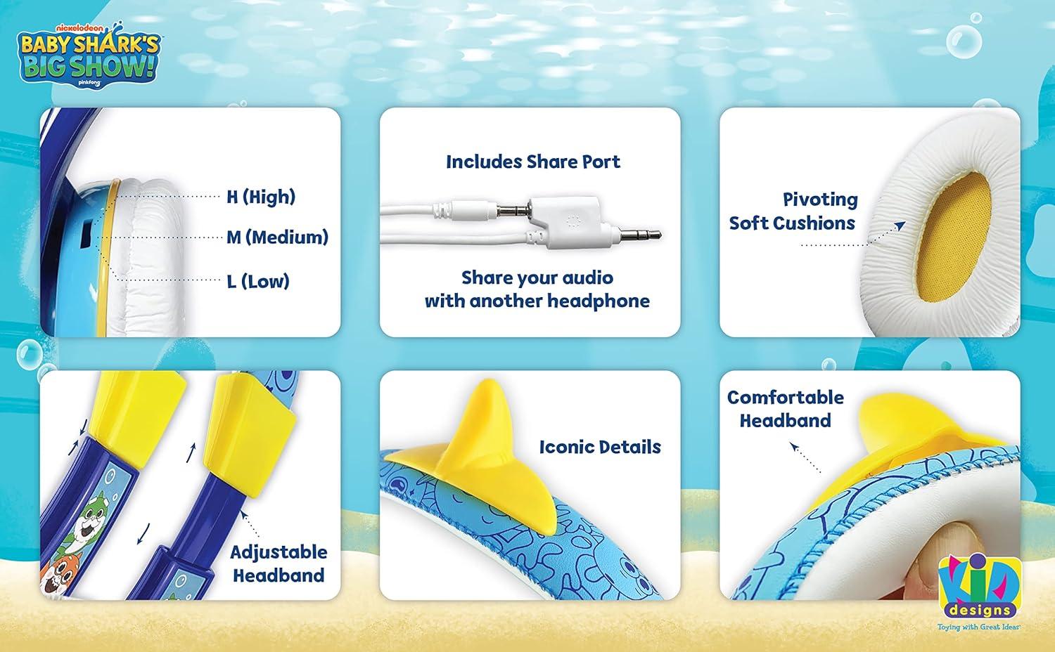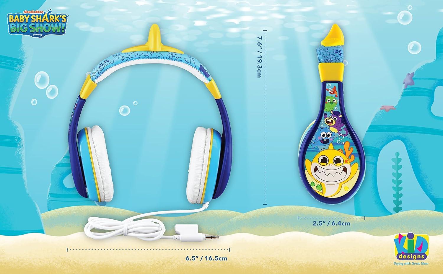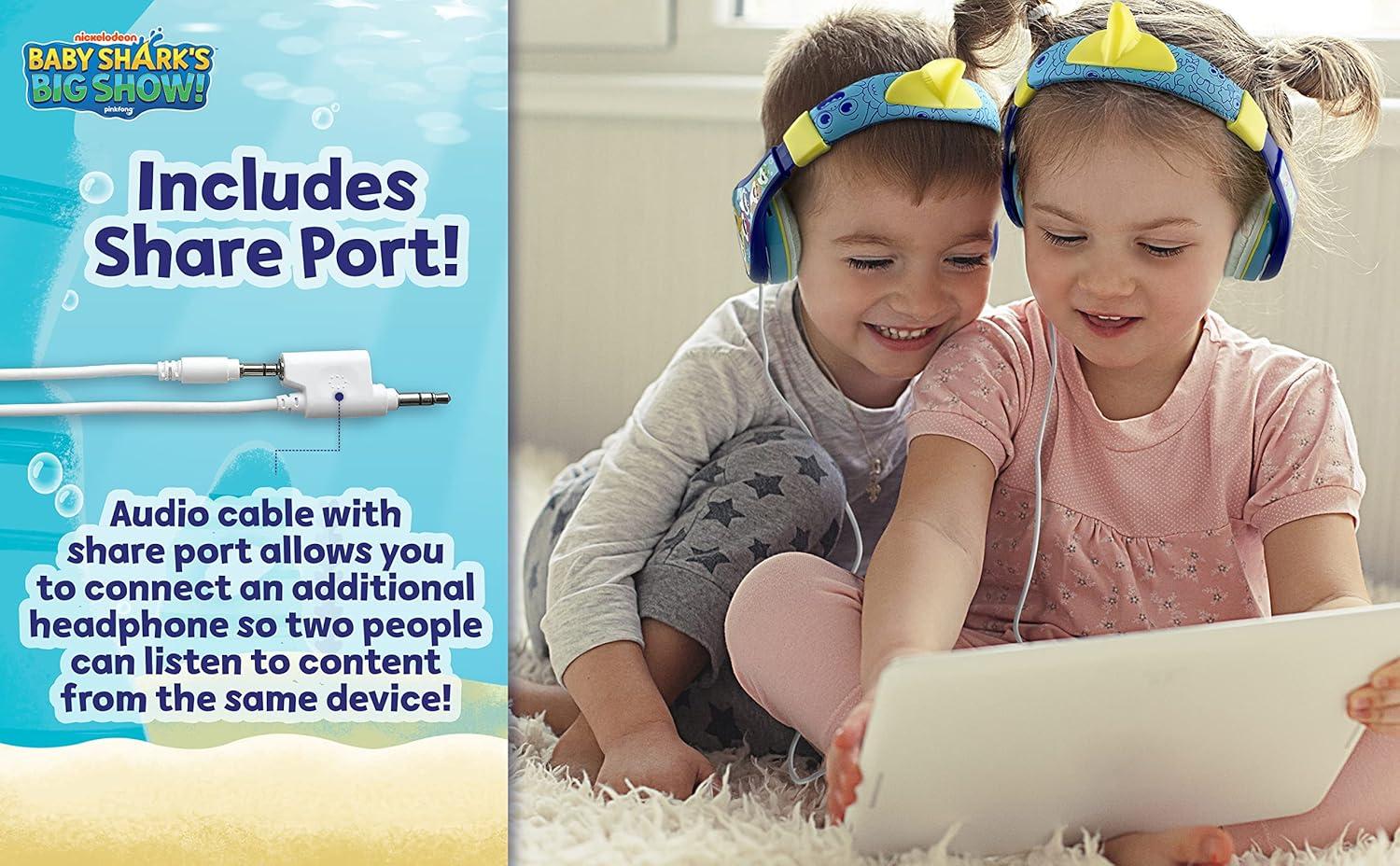 eKids Baby Shark Headphones for Kids, Wired for School, Home or Travel, Tangle-Free Toddler With Volume Control, 3.5mm Jack, Includes Splitter