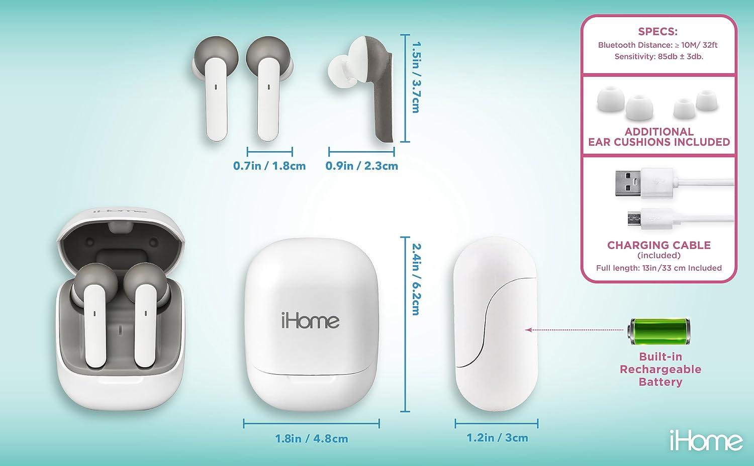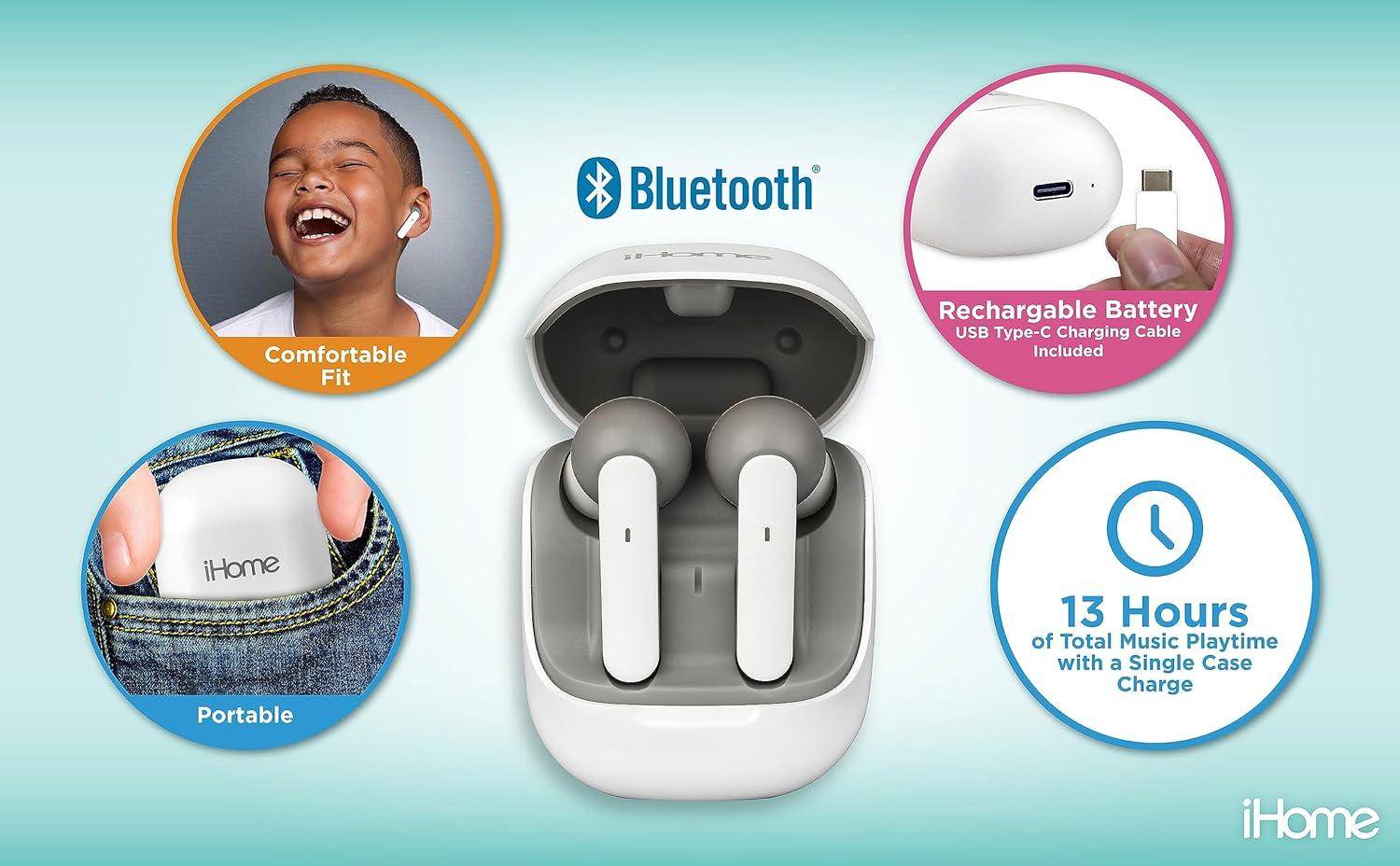 eKids Bluetooth Earbuds with Microphone, Kids Wireless Earbuds with Charging Case for Ear Buds, for School, Home, or Travel (White)