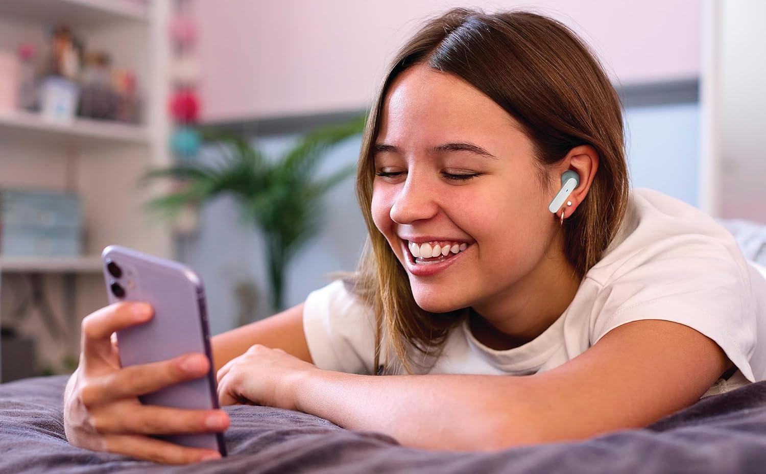 True Wireless Earbuds with Microphone: Chat with friends and family with ease during a video call or Zoom meeting. Ideal wireless earbuds for iPhone and Android. Great for computer learning, school activities, and traveling.