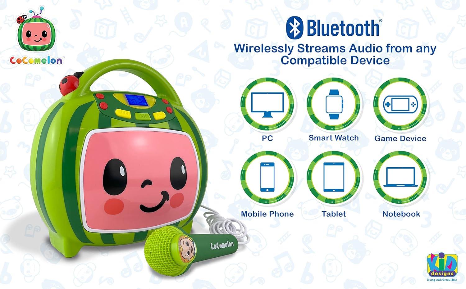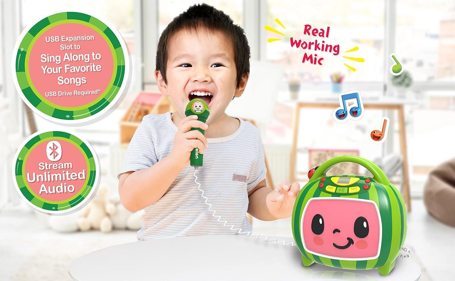 Bluetooth Boombox: Connect this party speaker to any compatible Bluetooth device and stream all your content wirelessly. Sing like a star to your favorite Cocomelon songs using the real working wired microphone.