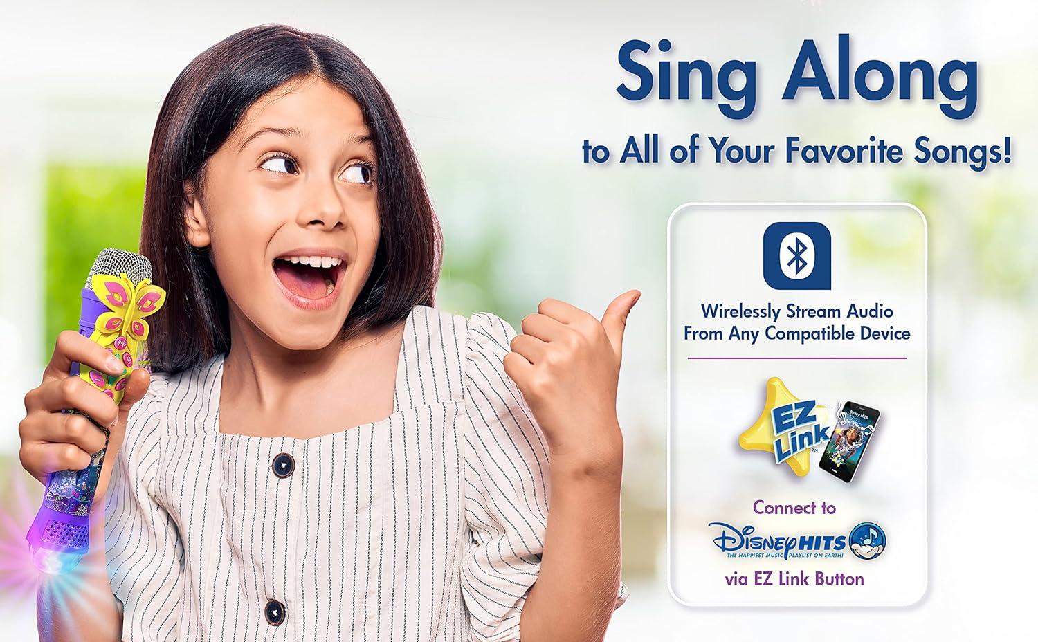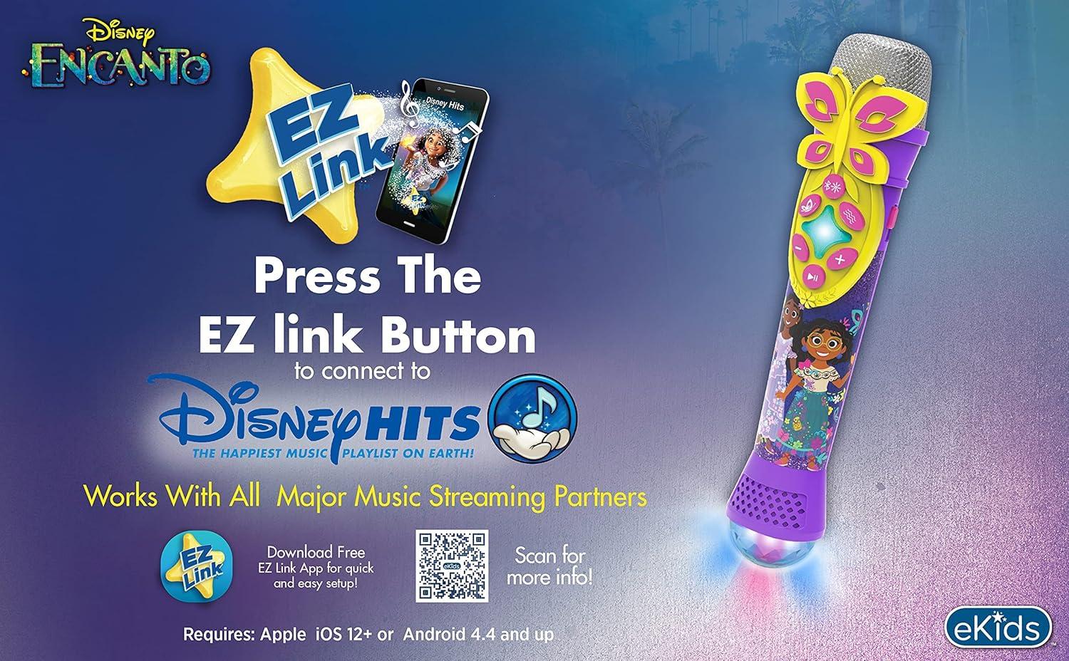 EZ Link Technology allows you to access your favorite Disney music with the push of a button! Instantly play hit songs from Encanto, including 'We Don't Talk About Bruno', when you use the EZ Link Setup app to easily connect this kids microphone to popular streaming services. (App required; see description for more details)