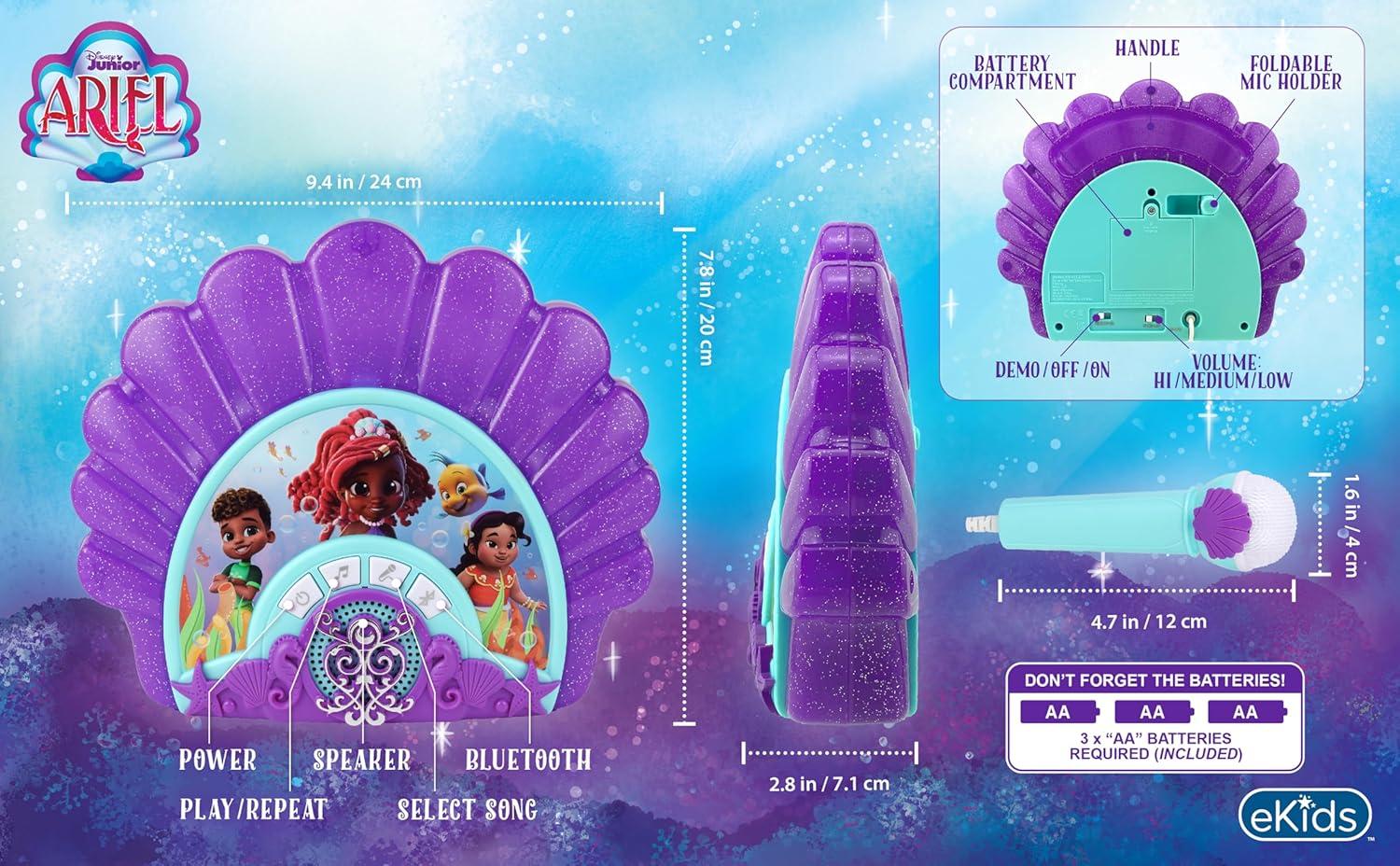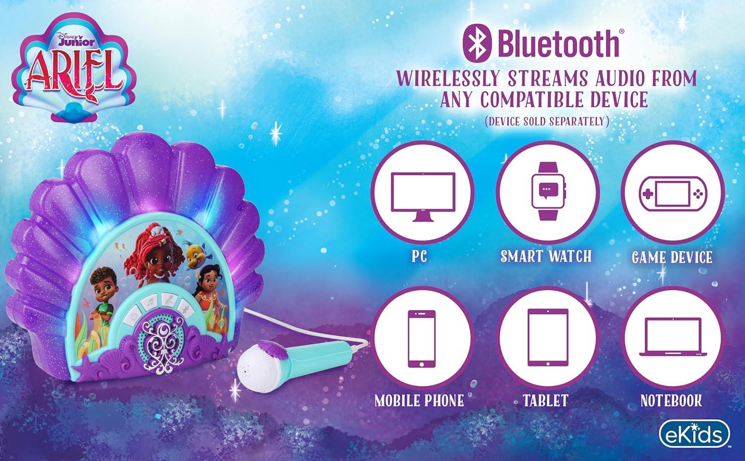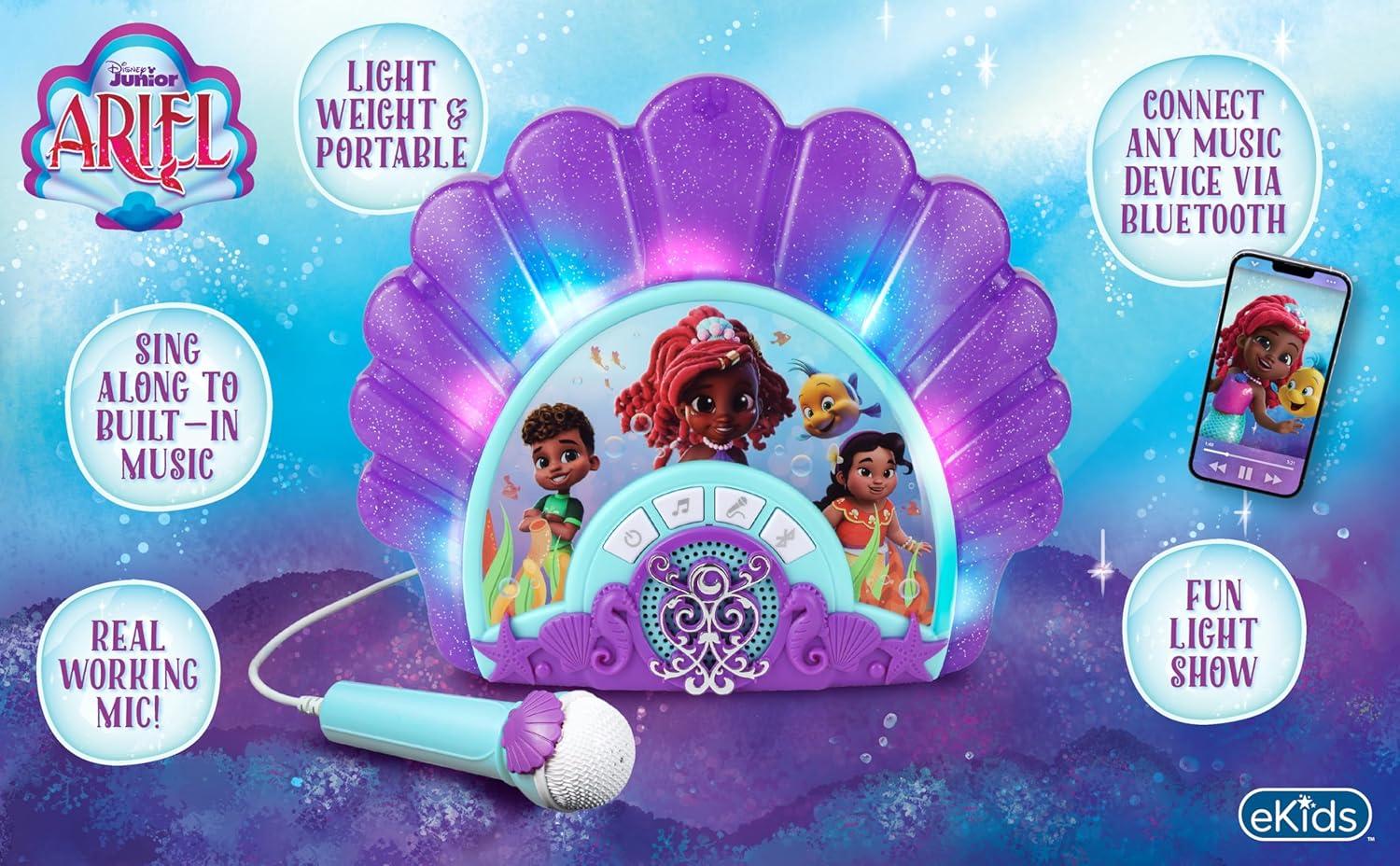 eKids Disney Junior Ariel Karaoke Microphone with Bluetooth Speaker for Fans of Disney Toys, Kids Karaoke Machine with Built in Music