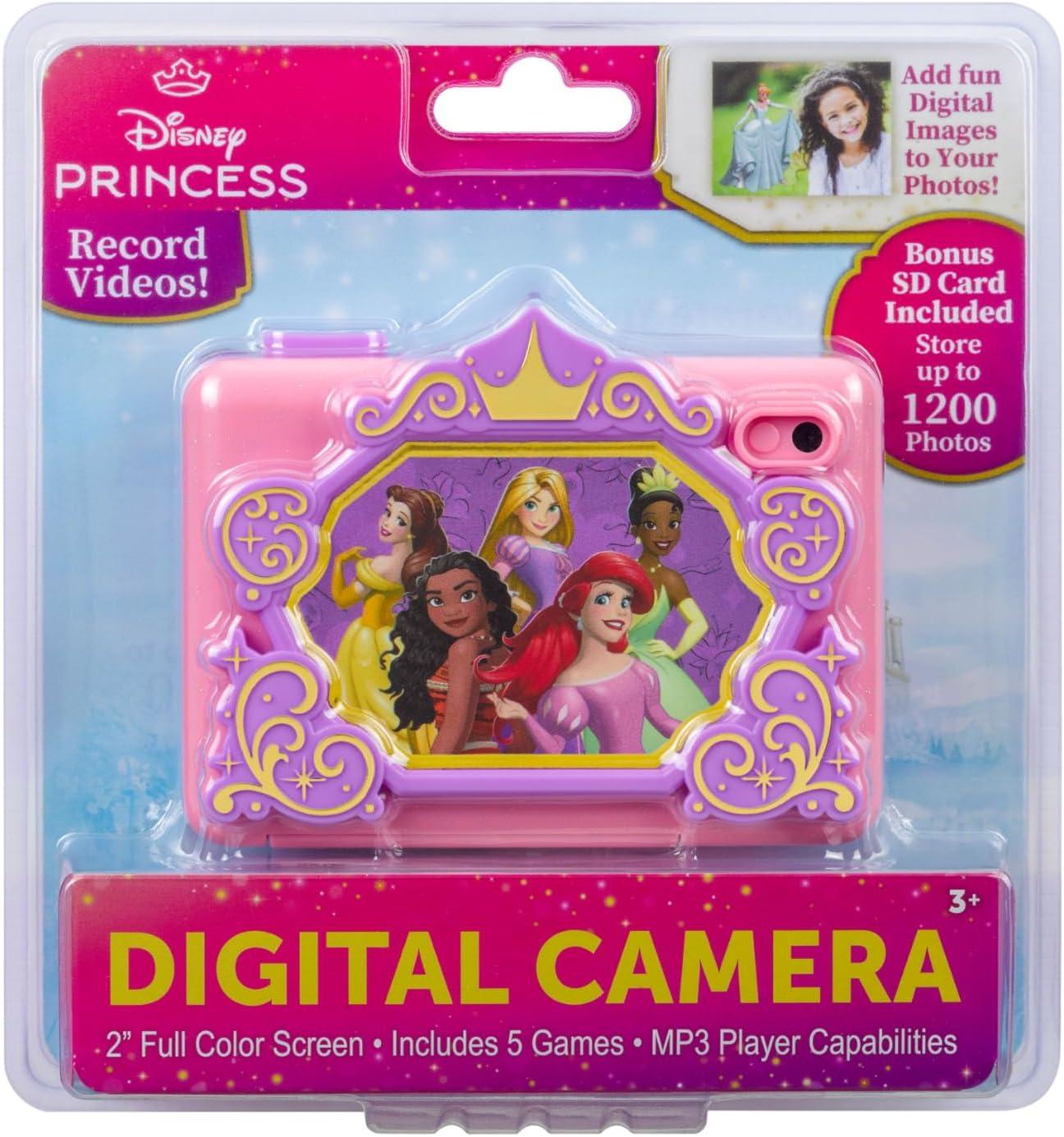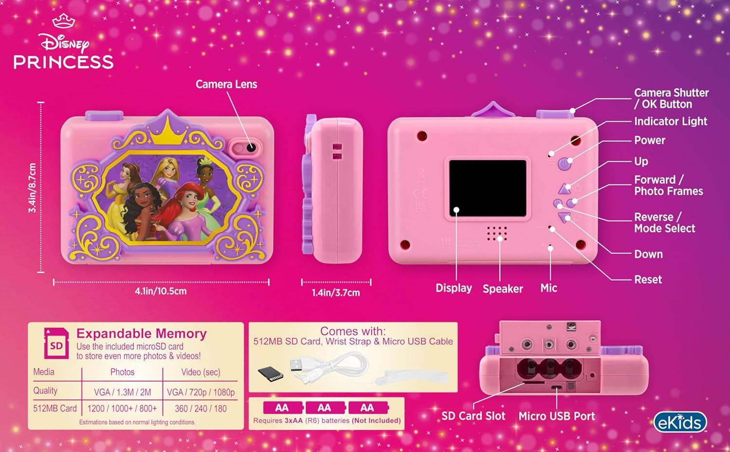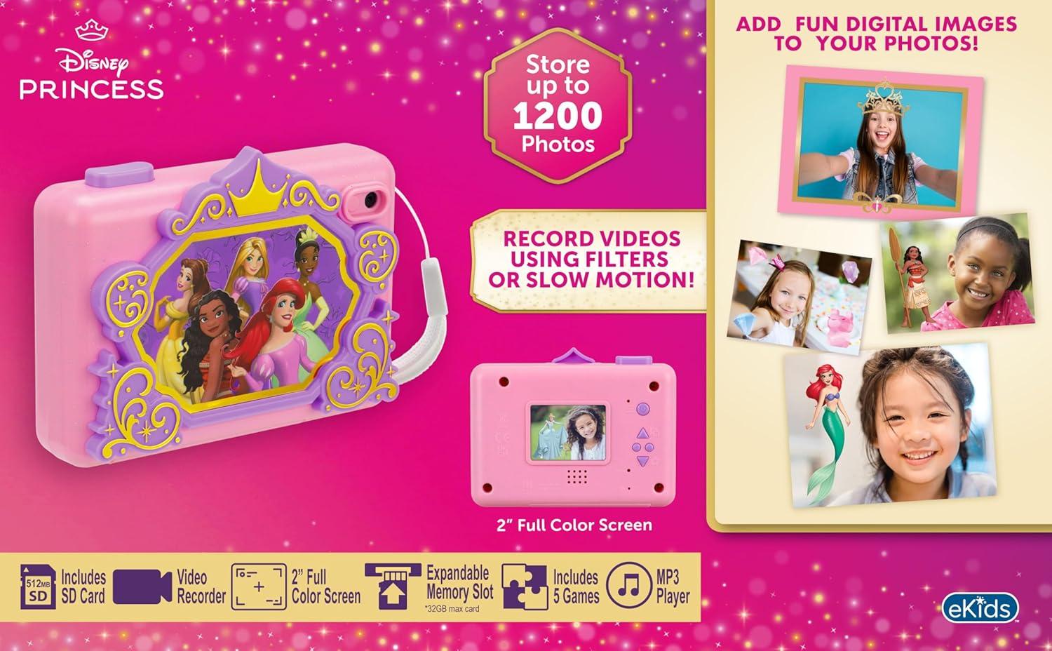ekids Disney Princess Kids Camera with SD Card, Digital Camera for Kids with Video Recording and Built-in Digital Stickers for Fans of Princess Toys