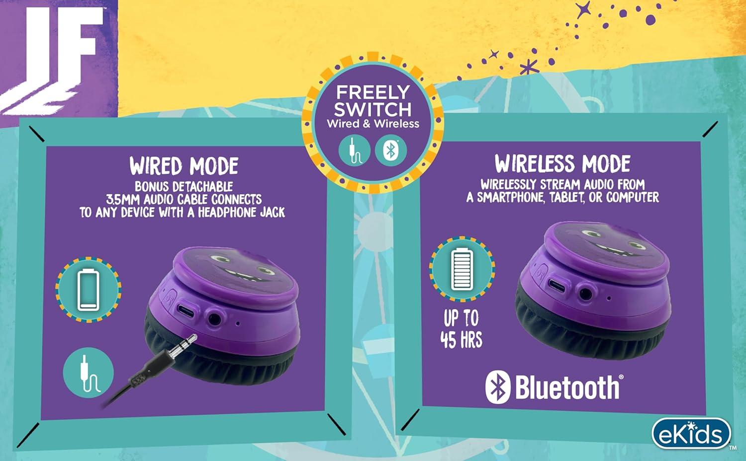 eKids IF Bluetooth Headphones, Wireless Headphones with Microphone Includes Aux Cord, Volume Reduced Kids Foldable Earphones for School, Home, or Travel