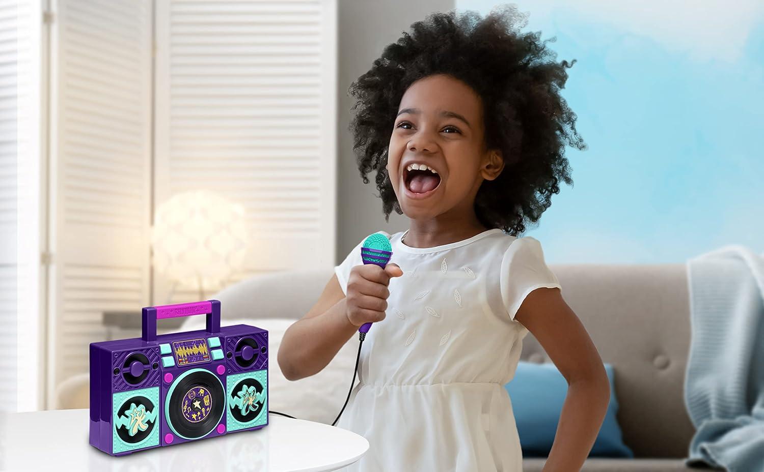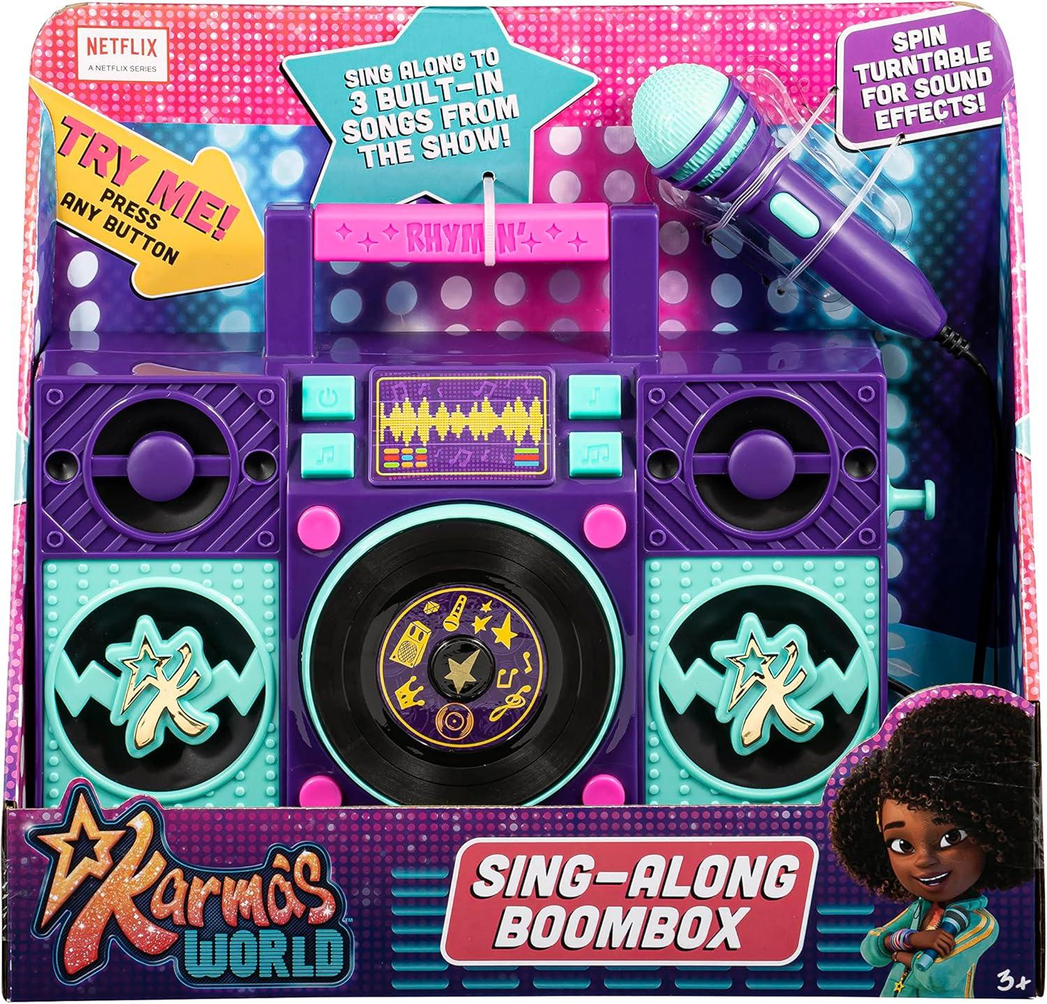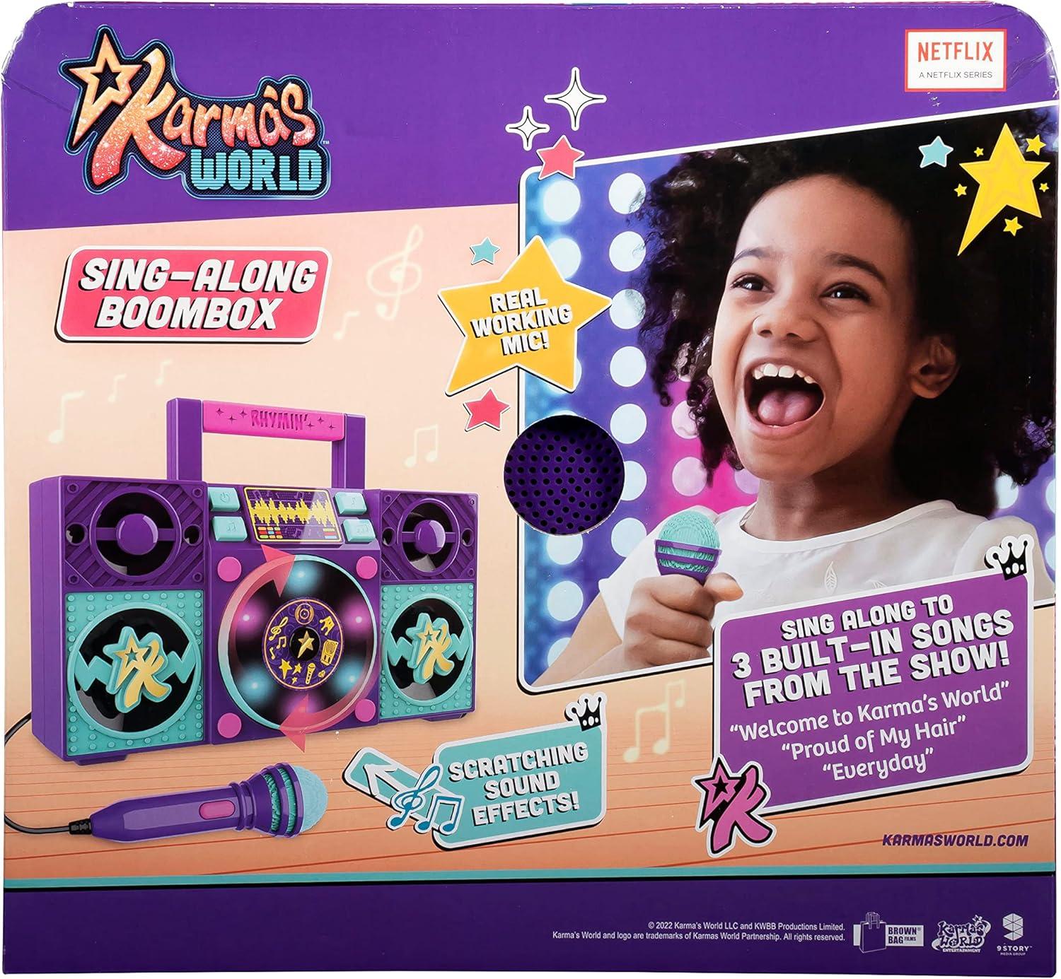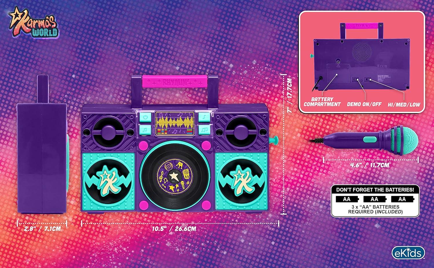 eKids Karma’s World Sing Along Boom Box Speaker with Microphone for Fans of Karma’s World Toys, Kids Karaoke Machine with Built in Music and Sound Effects