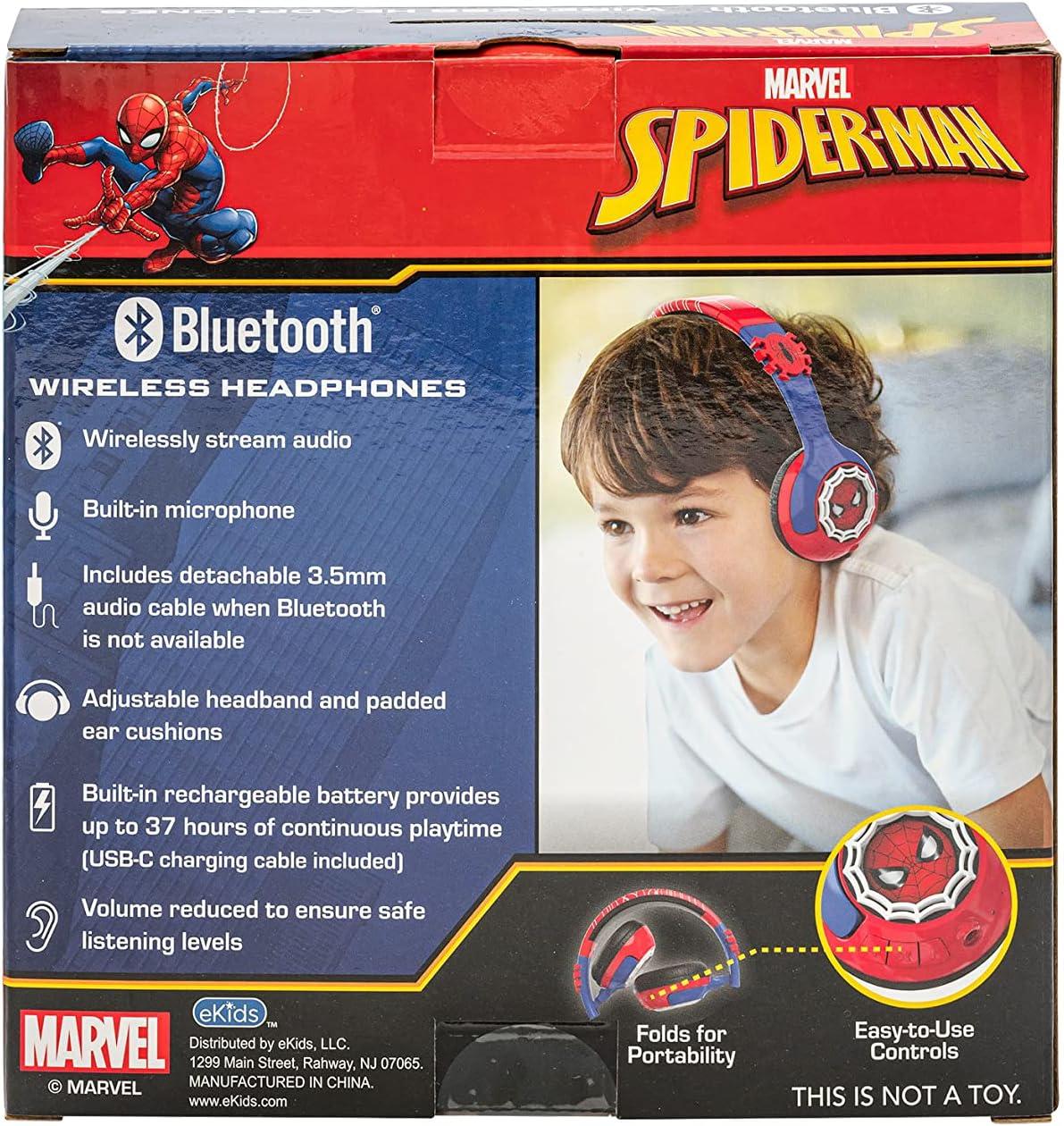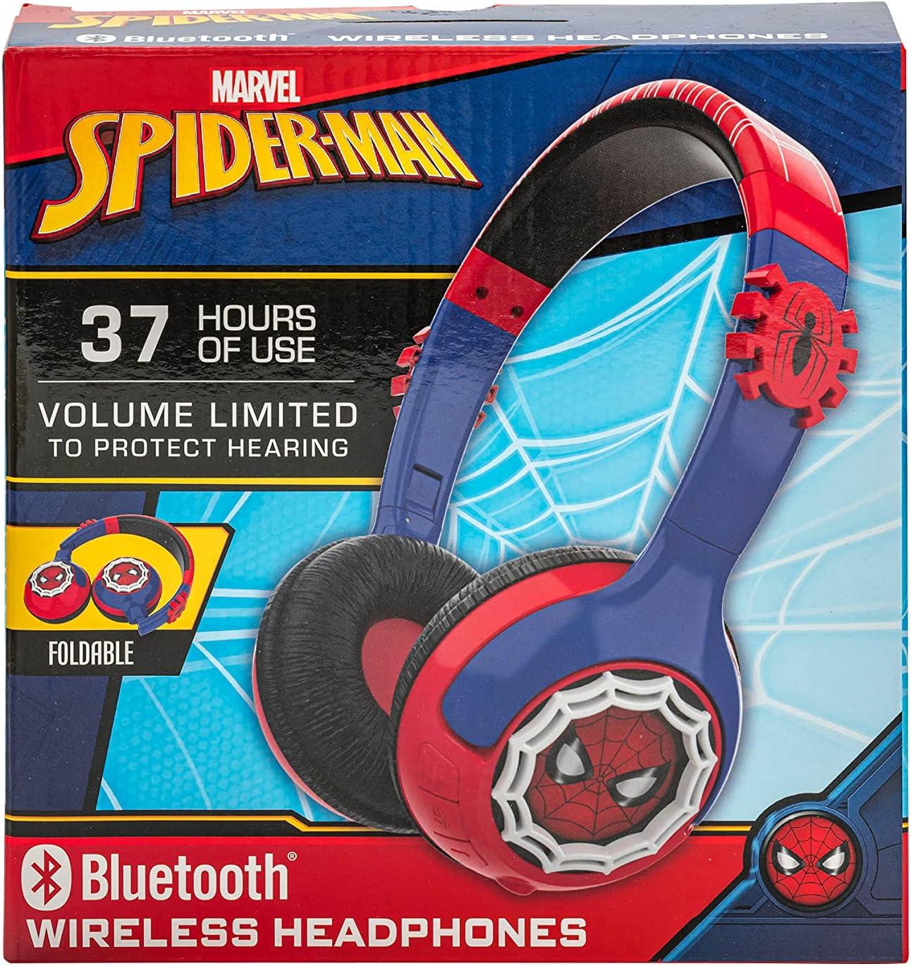 With cool graphics inspired by the iconic superhero, these Spiderman headphones make it easy to stream audio wirelessly. Listen to your favorite playlists, watch movies, TV, and YouTube, or use for remote learning, virtual classes, audiobooks, and more. These Bluetooth headphones for kids have reduced volume to ensure safe listening levels for little ears. The built- in rechargeable battery allows up to 37 hours of continuous playtime. Use the wireless headphones with microphone for talking to friends and family on a video call or Zoom meeting, too. A bonus detachable 3.5mm audio cable is included so you can connect to any device with a headphone jack. Adjustable headband and padded ear cushions provide maximum comfort and a custom fit. The foldable design is ideal for convenient travel and storage. If you are shopping for Spiderman gifts, these kids headphones are great for any occasion! Visit the ekids brand store to shop a variety of cool gifts for kids!