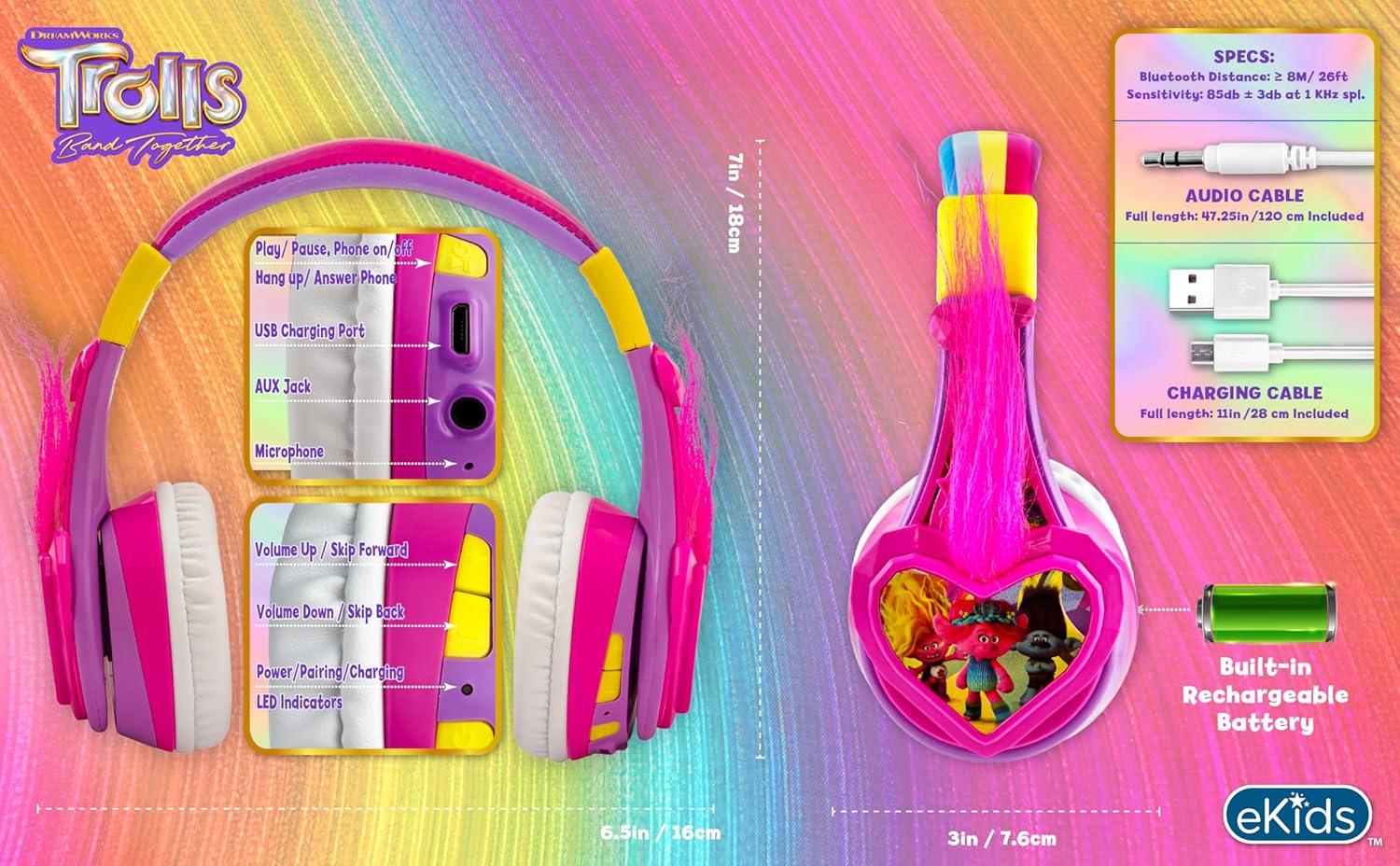 eKids Trolls Band Together Bluetooth Headphones for Kids, Wireless Headphones with Microphone Includes Aux Cord, Volume Reduced Kids Foldable Earphones for School, Home, or Travel