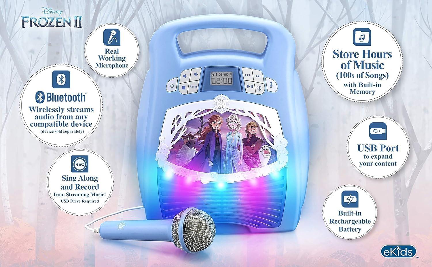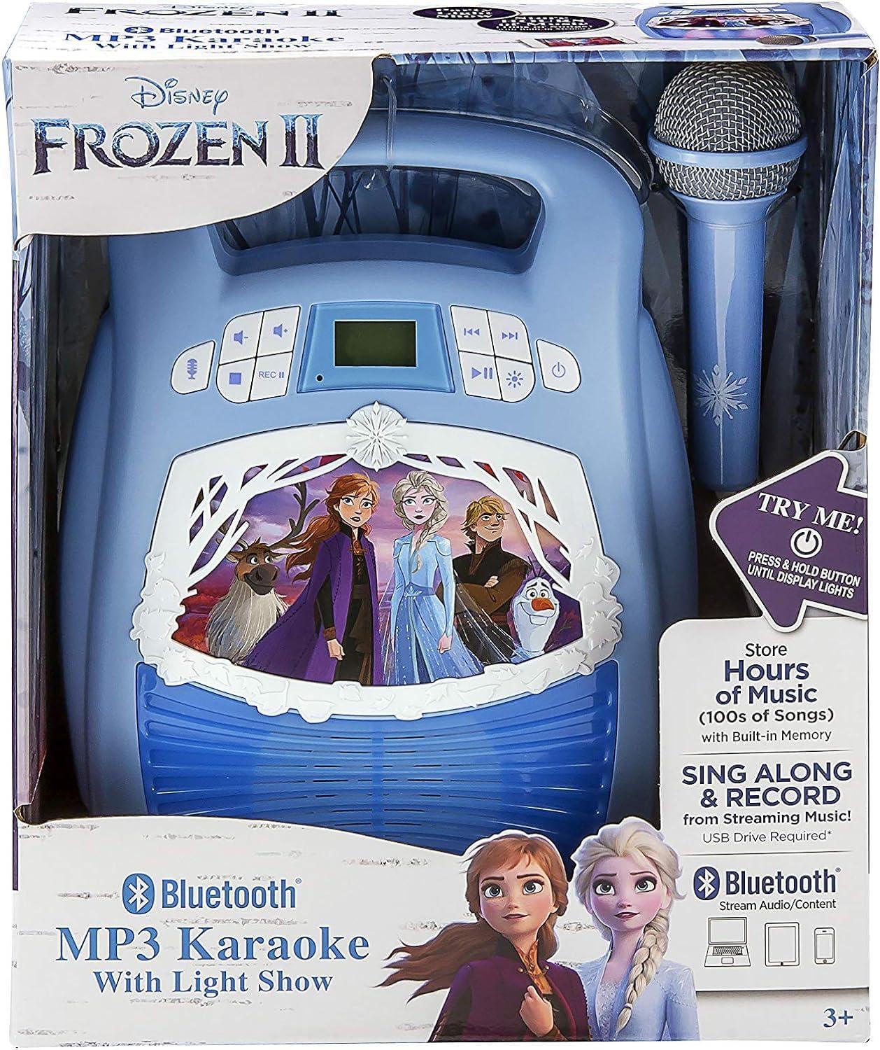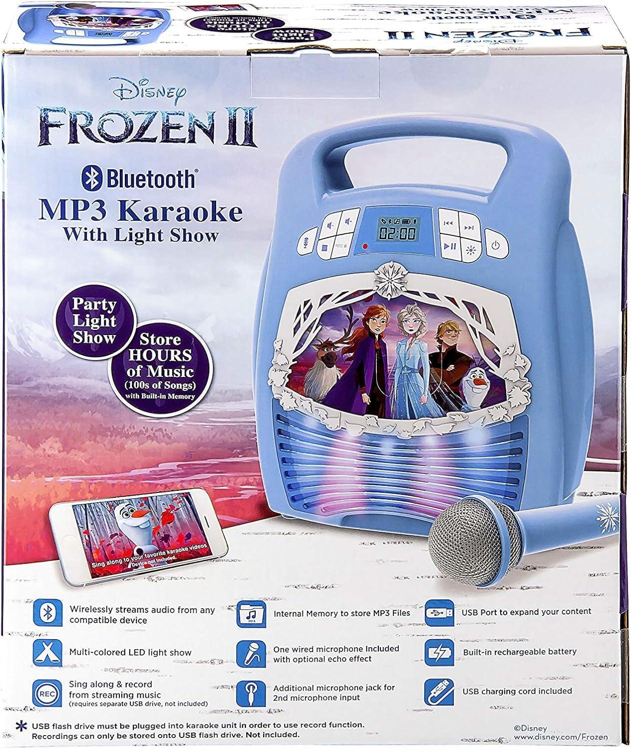 Frozen 2 Bluetooth Portable MP3 Karaoke Machine Player with Light Show Store Hours of Music with Built in Memory Sing Along Using The Real Working Microphone USB Port to Expand Your Content(Older Version)