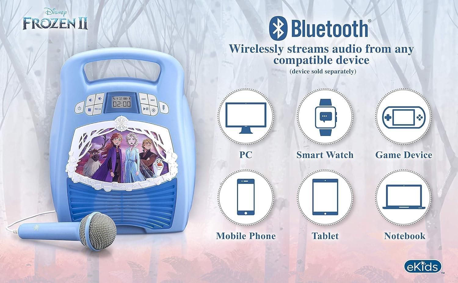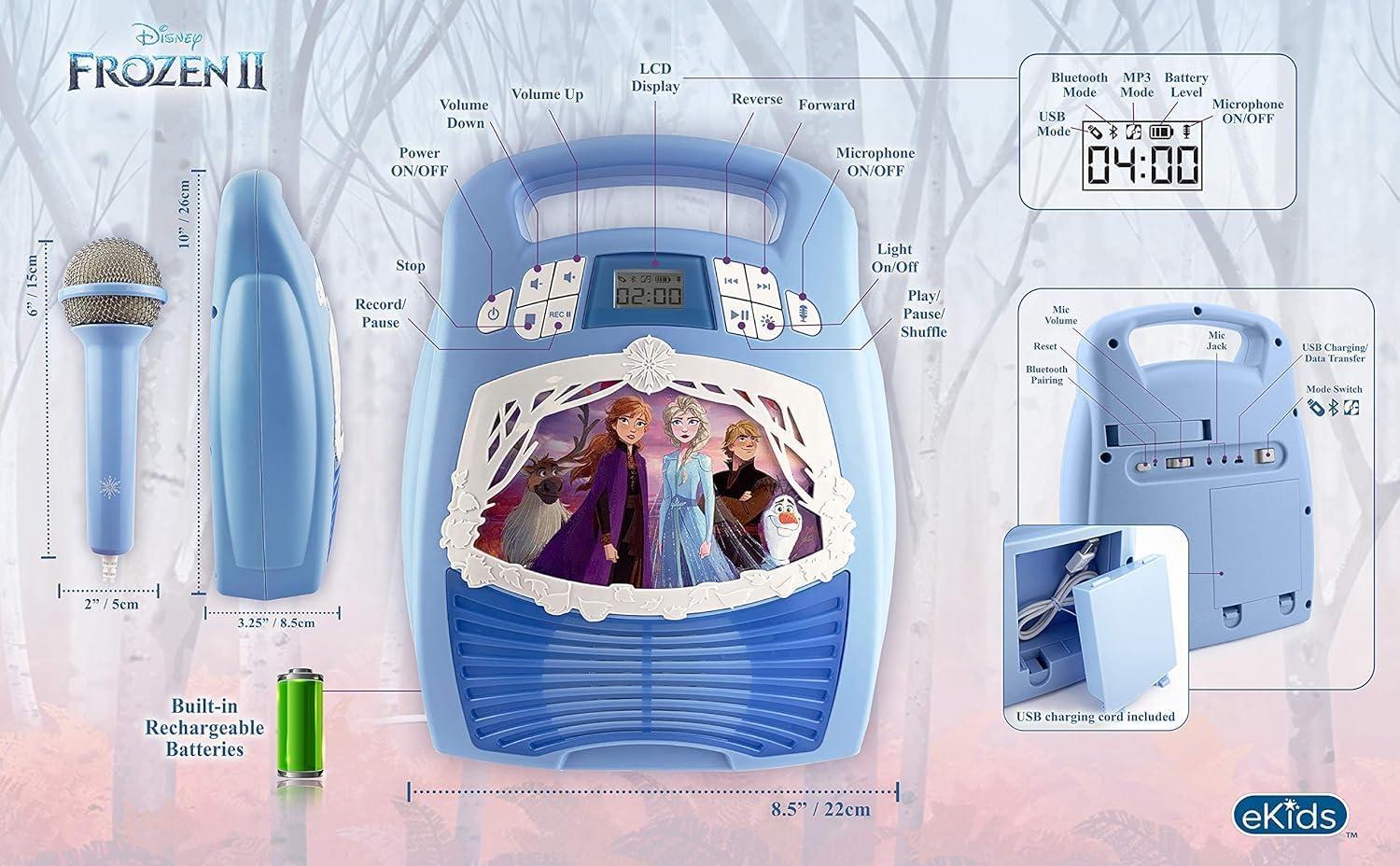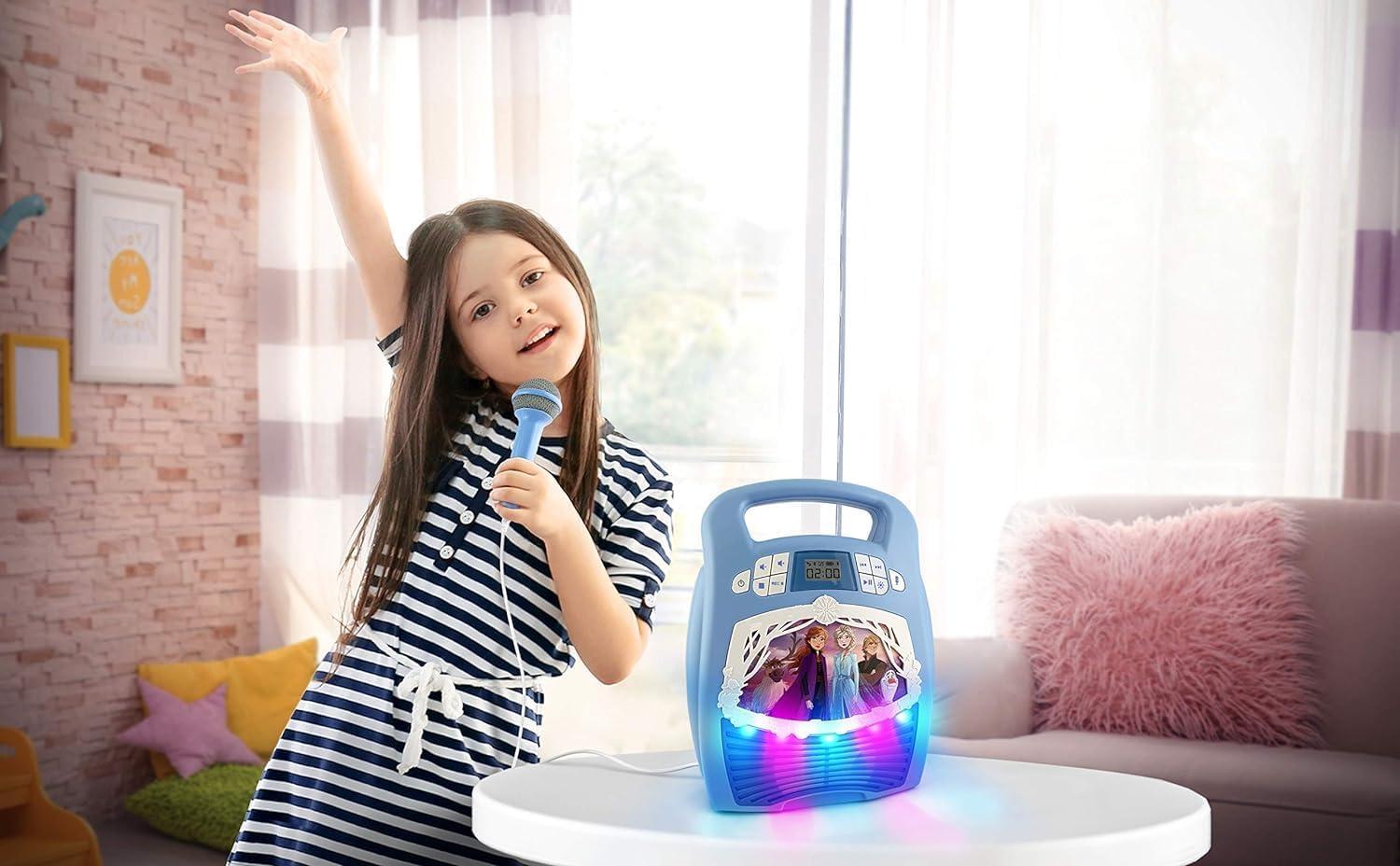 Frozen 2 Bluetooth Portable MP3 Karaoke Machine Player with Light Show Store Hours of Music with Built in Memory Sing Along Using The Real Working Microphone USB Port to Expand Your Content(Older Version)