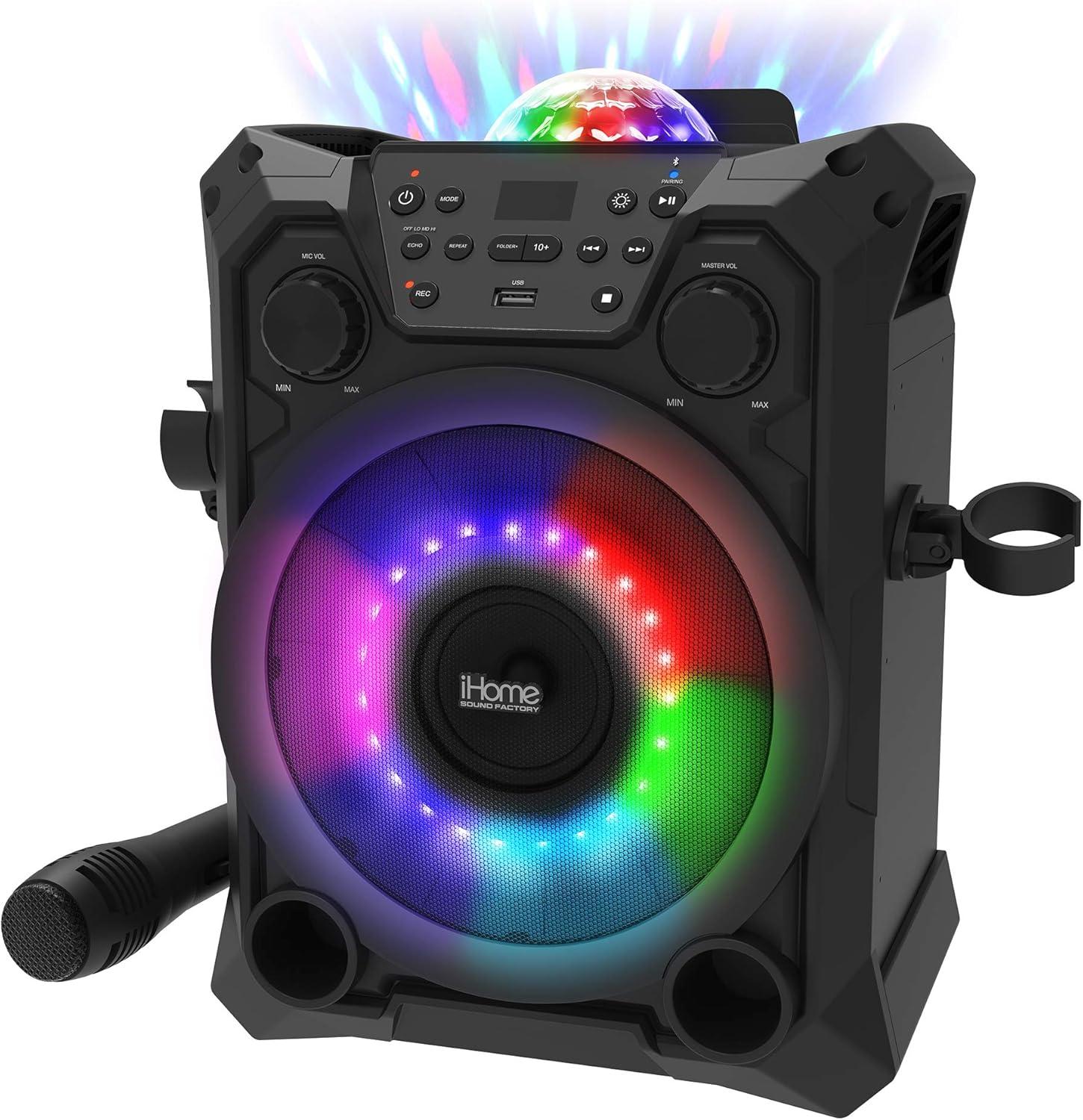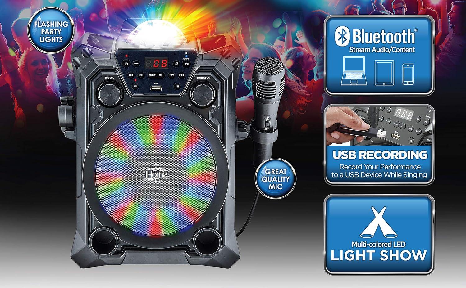 iHome Karaoke Machine with Bluetooth Speaker and Wired Microphone Designed for Kids and Adults, Includes USB Recording Feature and Party Lights